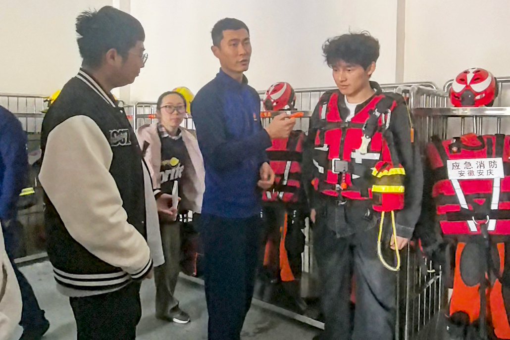 参观过程中,学生们专注倾听、积极互动,不时驻足记录要点。2025级数字人文专业学生王晓琦穿戴消防救生衣后深有感触:“仅穿救生衣行走就倍感沉重,难以想象消防员身着全套装备奔赴火场时的艰辛与担当。”