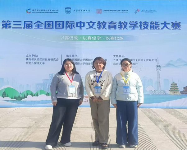 2025年11月21日至23日,由陕西省汉语国际教育研究会、西安外国语大学主办的第三届全国国际中文教育教学技能大赛在陕西西安顺利举办。由张瑾老师带队,人文学院国际中文教育专业2025级硕士研究生夏翠云和汉语国际教育2023级本科生王永鑫参加参加了本次大赛。经过激烈角逐,夏翠云和王永鑫两位同学荣获优秀奖,张彤彤、张莹两位老师荣获“优秀指导教师奖”。
