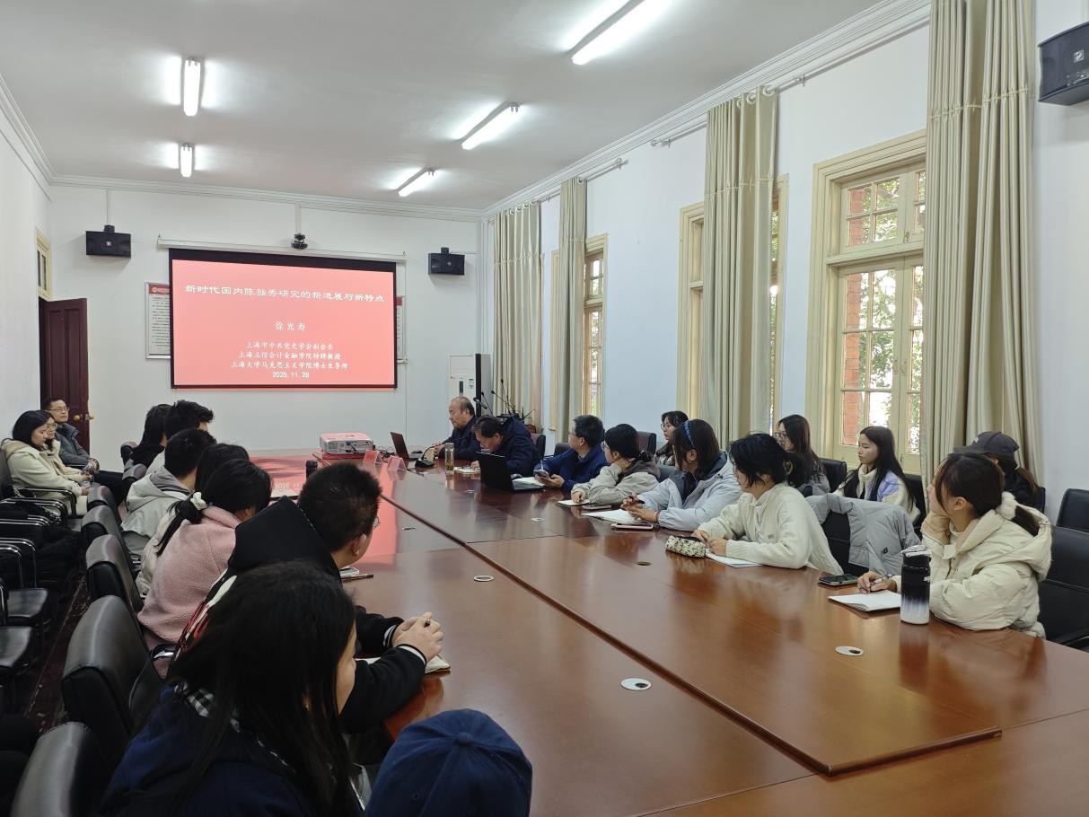 11月28日下午,上海立信会计金融学院特聘教授、博士生导师徐光寿教授应邀做客敬敷人文讲坛,作题为“新时代以来国内陈独秀研究的新进展与新特点”的学术讲座。本场讲座由人文学院教授董根明主持,人文学院部分教师及研究生和本科生参加活动。
