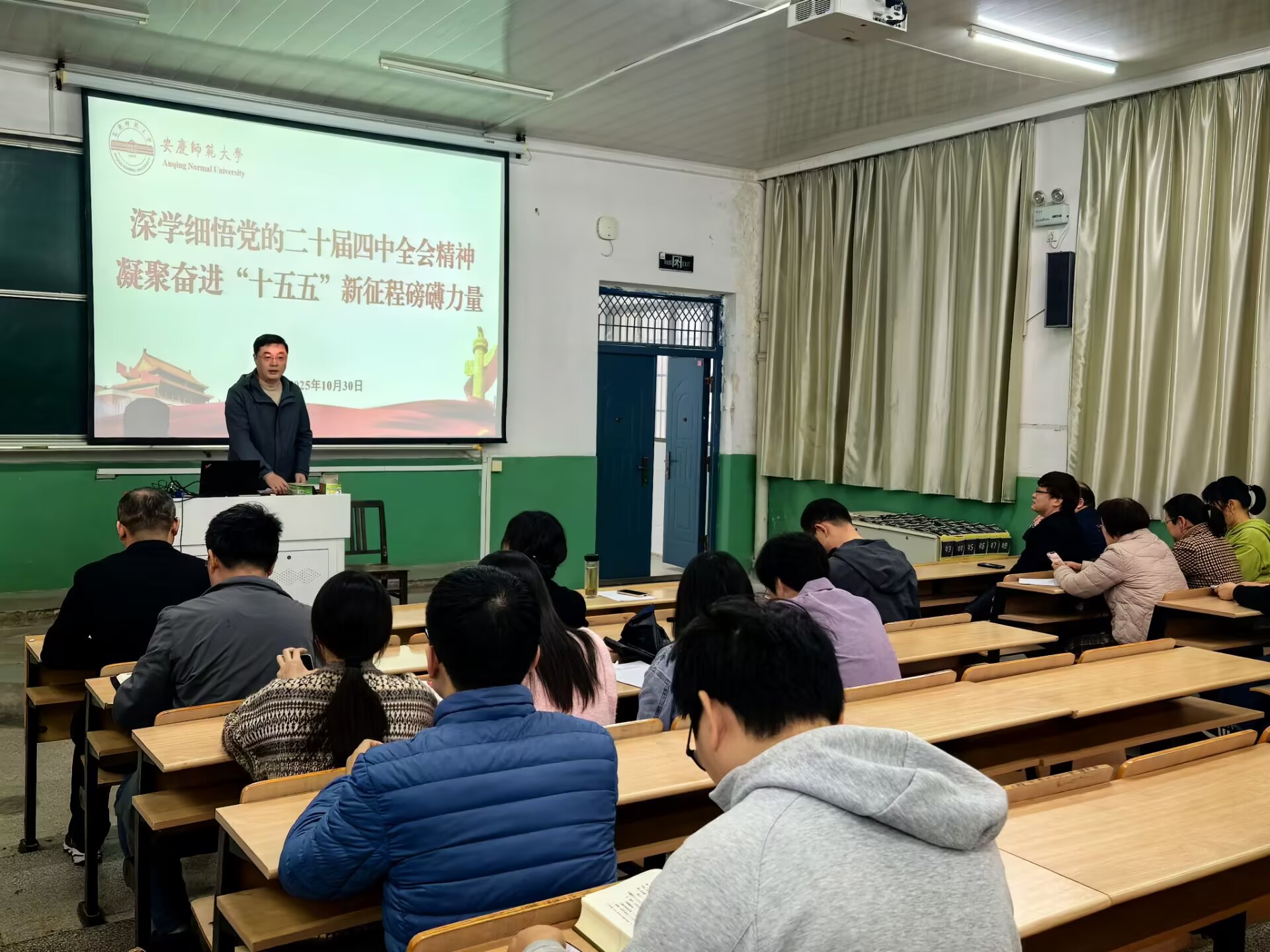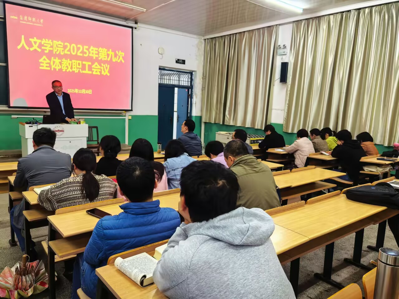10月30日,人文学院召开2025年第九次全体教职工会议,开展党的二十届四中全会精神宣讲并部署近期重点工作。学院领导班子及全体教职工参加会议,院长汪孔丰主持会议。党委书记王波以“深学四中全会精神 奋进‘十五五’新征程”为主题做了党的二十届四中全会精神宣讲。