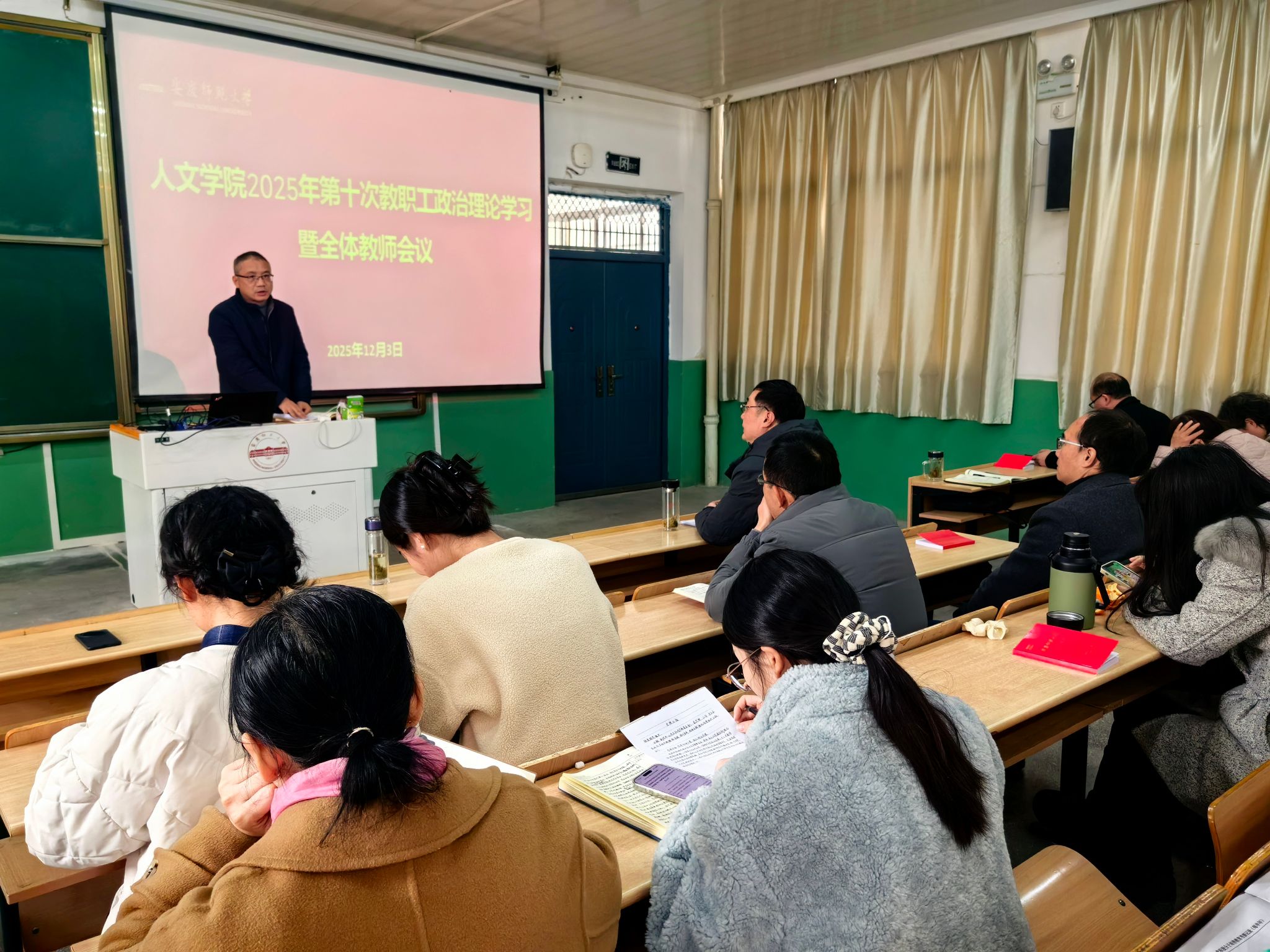 学院党委书记王波向全体教职工开展了党的二十届四中全会精神宣讲,宣讲聚焦繁荣发展社会主义文化。会议要求,全体教师要立足文化强国战略部署,深挖安徽长江文化、黄梅戏文化等地域特色资源,推动文化传承与学术研究、人才培养深度融合,以学科优势赋能地方文化事业与产业协同发展,为中国式现代化安徽篇章注入人文力量。