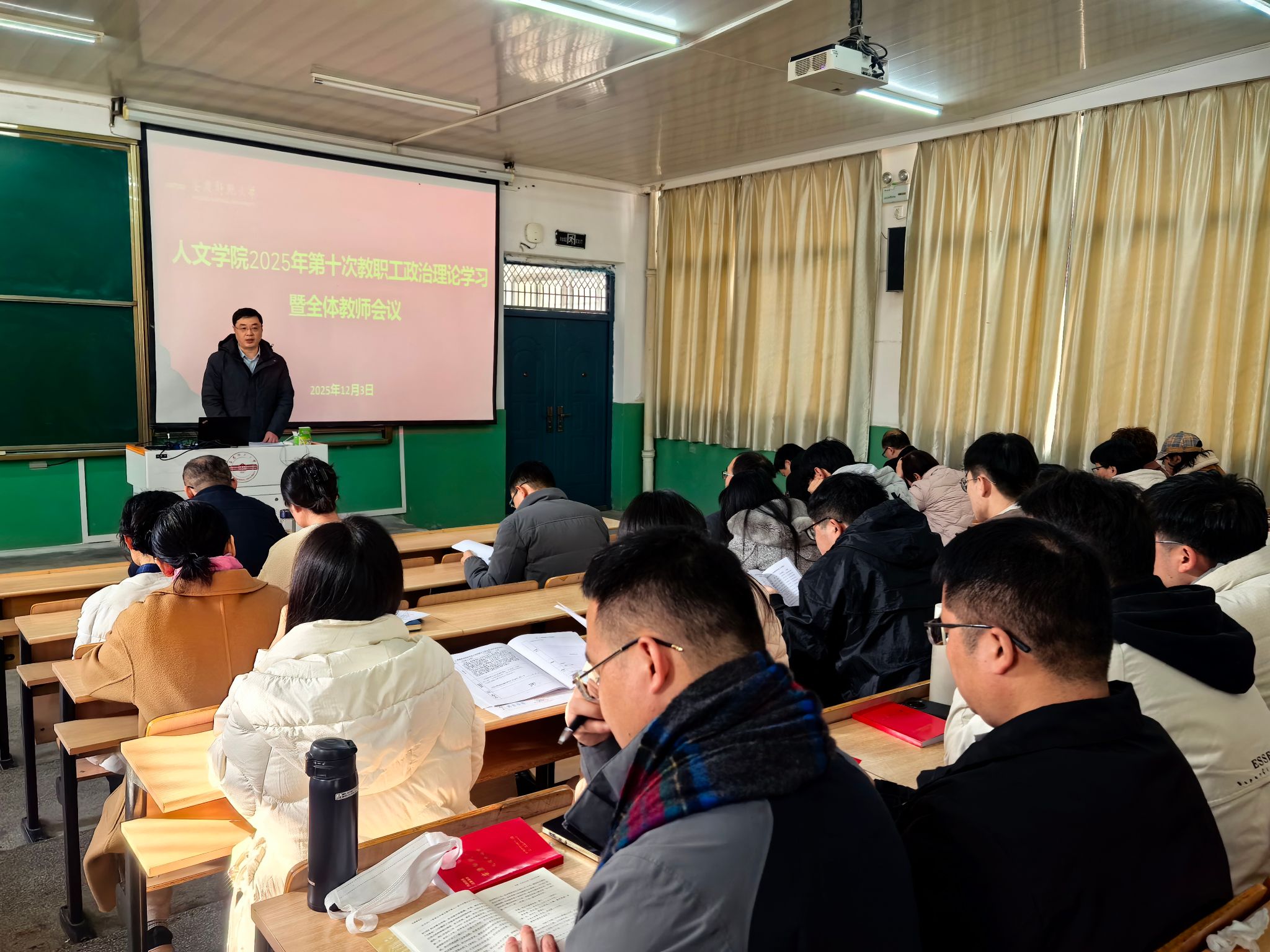 12月3日,人文学院在菱湖校区理二阶教室召开2025年第十次教职工政治理论学习暨全体教师会议。学院领导班子及全体教职工参会,会议由院长汪孔丰主持。