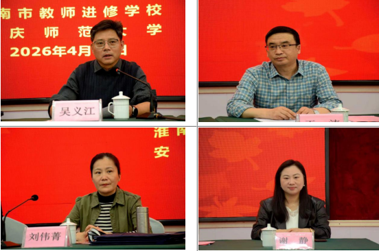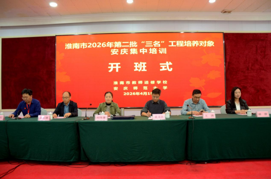 4月19日下午,由安庆师范大学人文学院承办的淮南市2026年第二批“名师、名班主任、名校长”(以下简称“三名”)工程培养对象安庆集中培训开班仪式,在安庆大酒店国际厅隆重举行。安庆师范大学继续教育学院副院长吴义江、人文学院副院长周红兵,淮南市教师进修学校教研处主任刘伟菁、督导处主任王涛、教研处副主任王志德、教研处干事谢静,以及培训班全体工作人员与115名“三名”培养对象共同出席仪式。开班式由周红兵副院长主持。