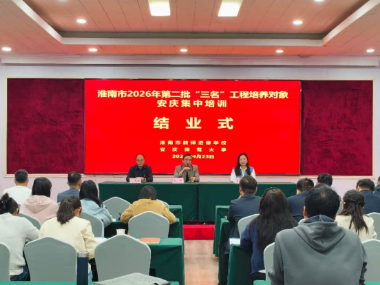 4月23日上午,由人文学院承办的淮南市2026年第二批“名师、名班主任、名校长”工程培养对象安庆集中培训结业仪式在安庆大酒店举行,为期5天的集中研修至此圆满落下帷幕。来自全市基础教育领域的115名培养对象齐聚一堂,共话学习收获,共启教育新程。